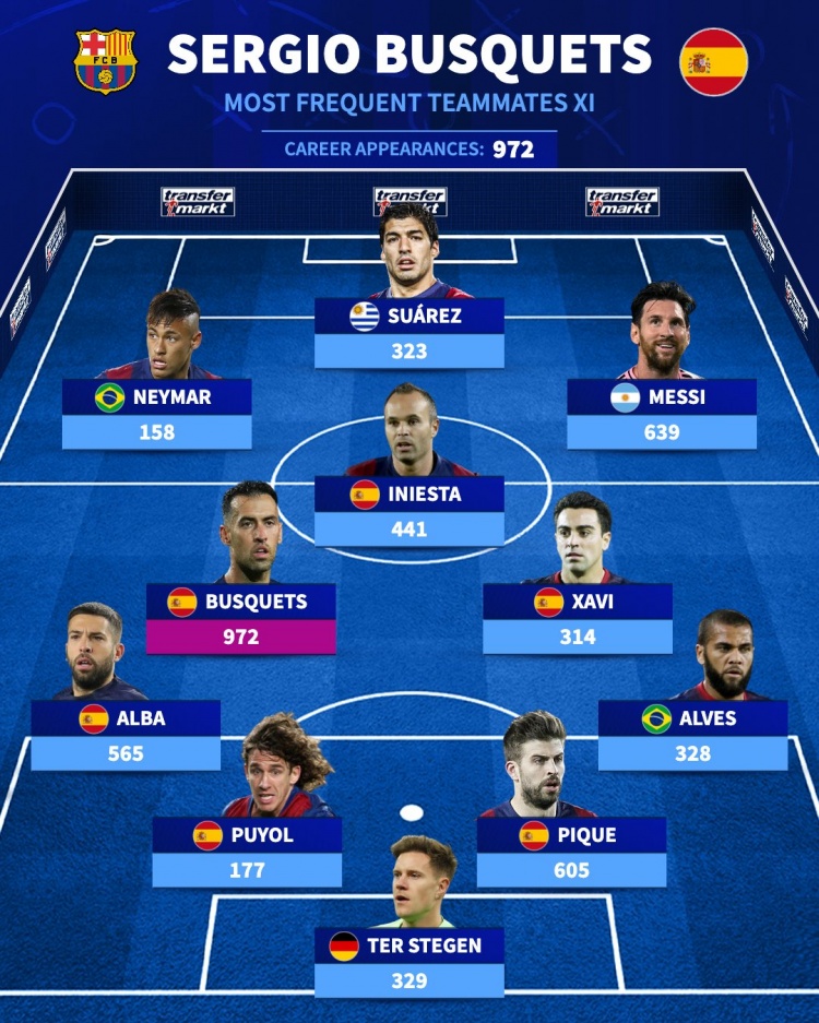 德转评布斯克茨最常搭档11人阵形 :梅西639场第1,皮克605场第2
