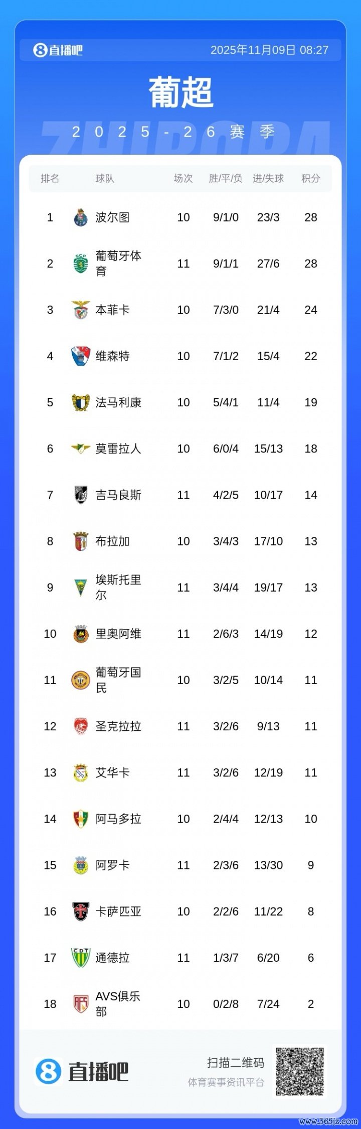 葡超积分榜,波尔图10轮28分居首,葡萄牙体育11轮28分第二,本菲卡10轮24分第三。