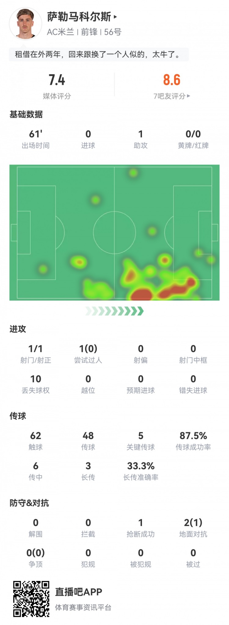 突然开窍!萨勒马科尔斯数据:1射1正,5次关键传送球 !评分7.4