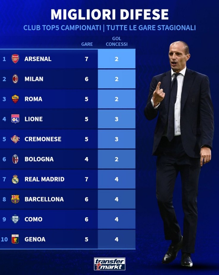 五大职业联赛 球队各项赛事丢球最少榜:阿森纳7场2球居首,米兰次席