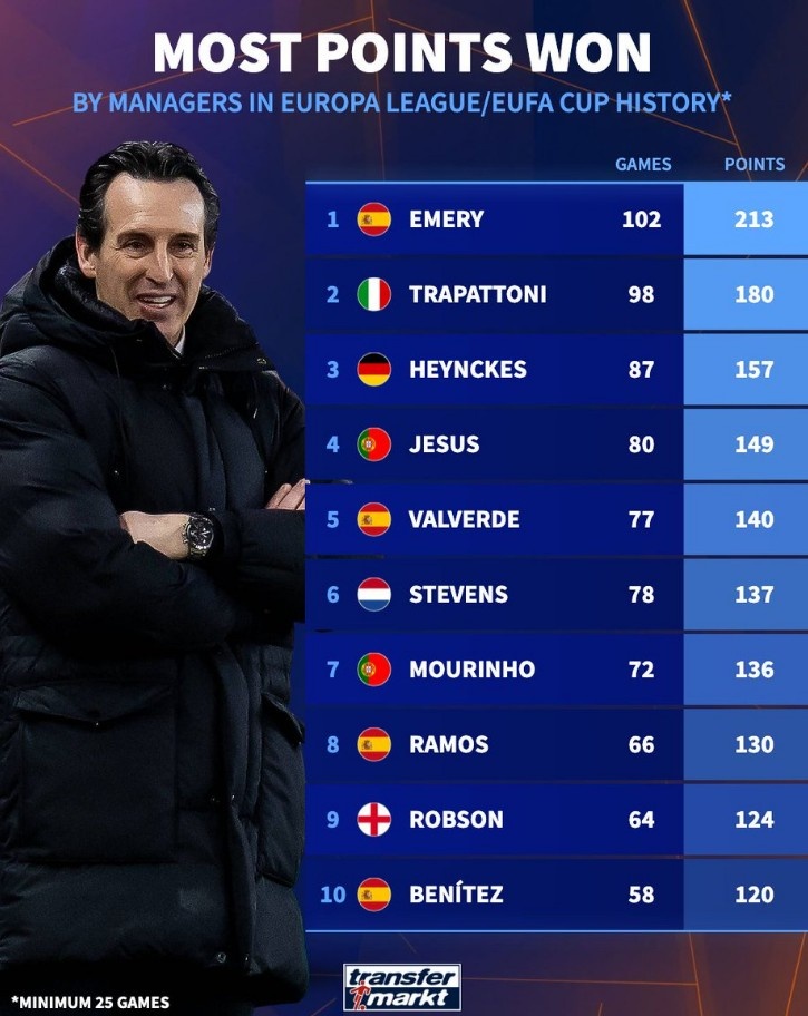 9月25日讯 德转盘点了欧联杯历史上主帅赢得积分最多记录 ,其中埃梅里居首,足球直播无插件免费在线观看本赛季执教维拉的他是否能夺得个人第五座欧联杯第一名 值得期待。以下为具体榜单:
