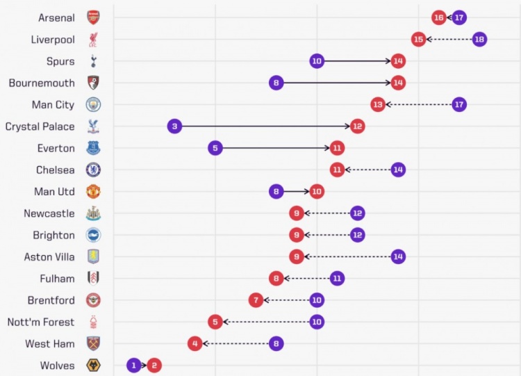 英超球队较上赛季同期积分:水晶宫+9分,阿森纳-1分、利物浦-3分