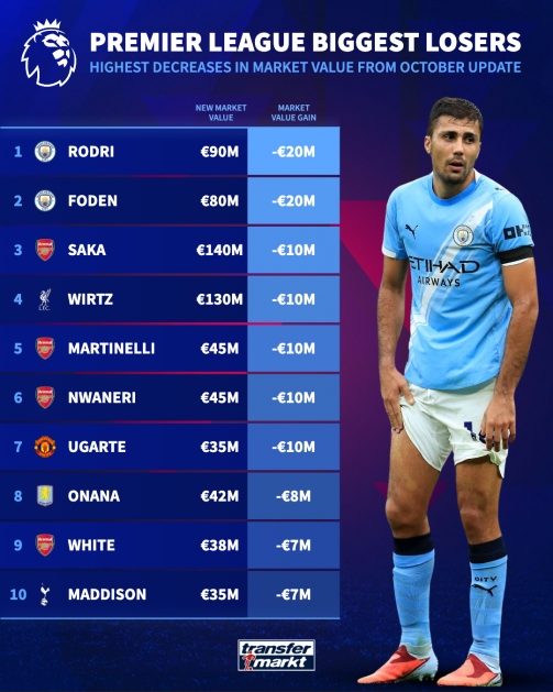 曼城亿元先生-2!罗德里、福登身价同跌2000万,都跌至亿元以下